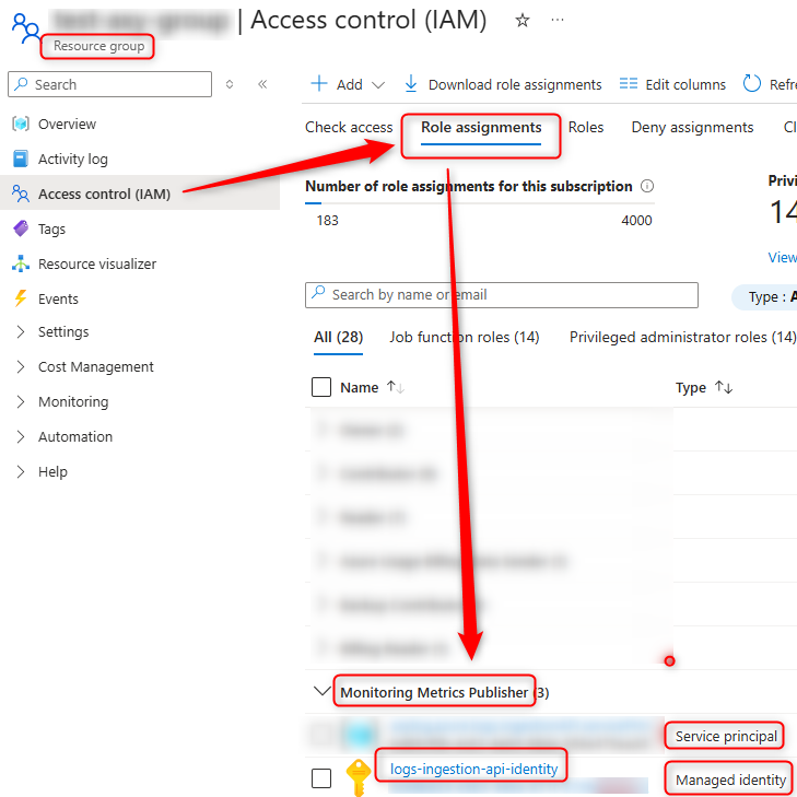 Please note to better keep the Azure dcr and dce resources in the same Azure resource group and add the Monitoring Metrics Publisher access role assignement to the Service Principal (appId) and/or the system/user managed identity of this resource group
