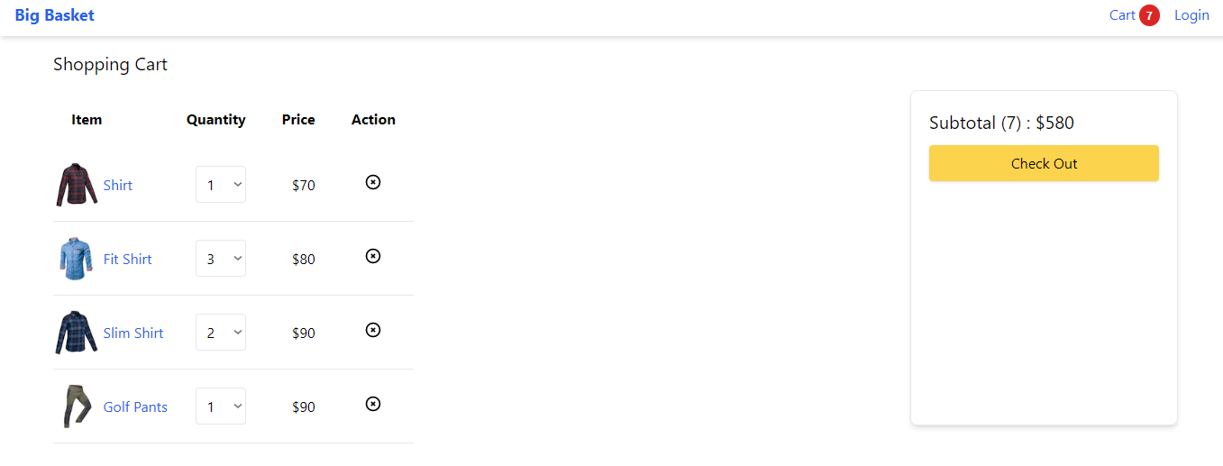 - Cart : User can change quantity(limited) of the items and can remove item if user added the same item 5 times from home page it will show as item1 = 5qty.