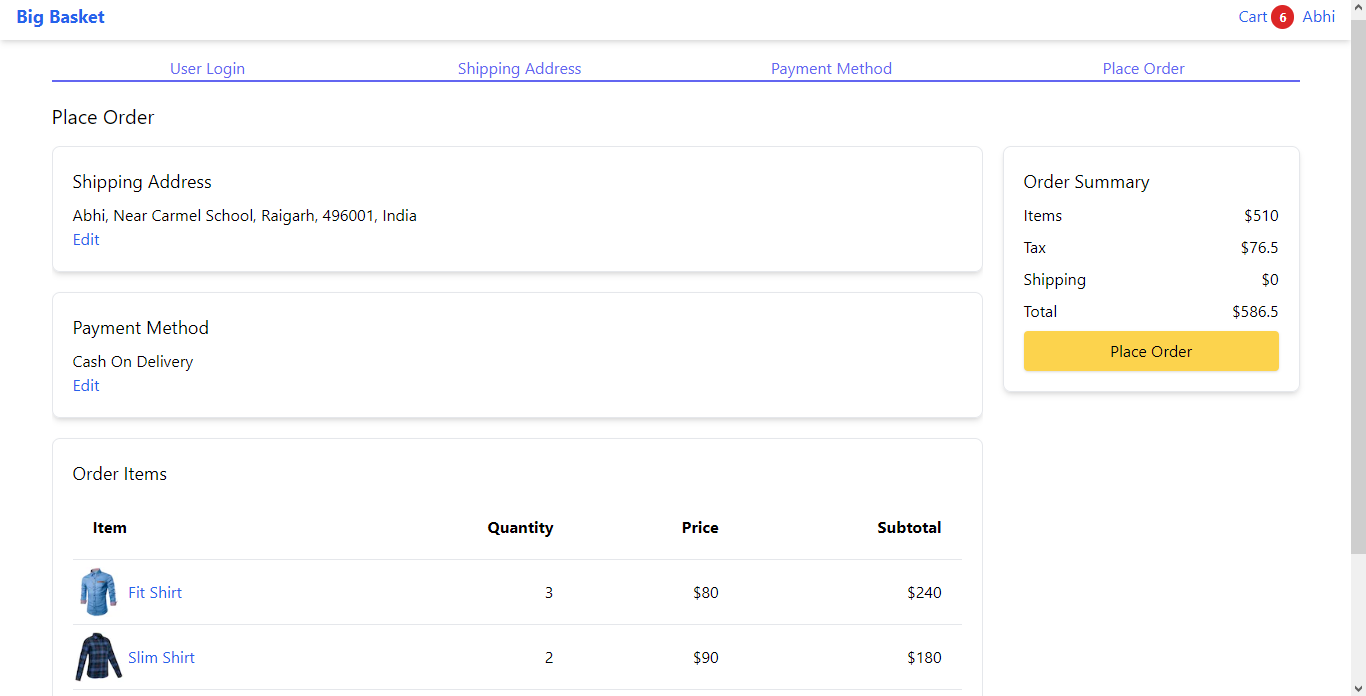 - Place Order : Place the Order.