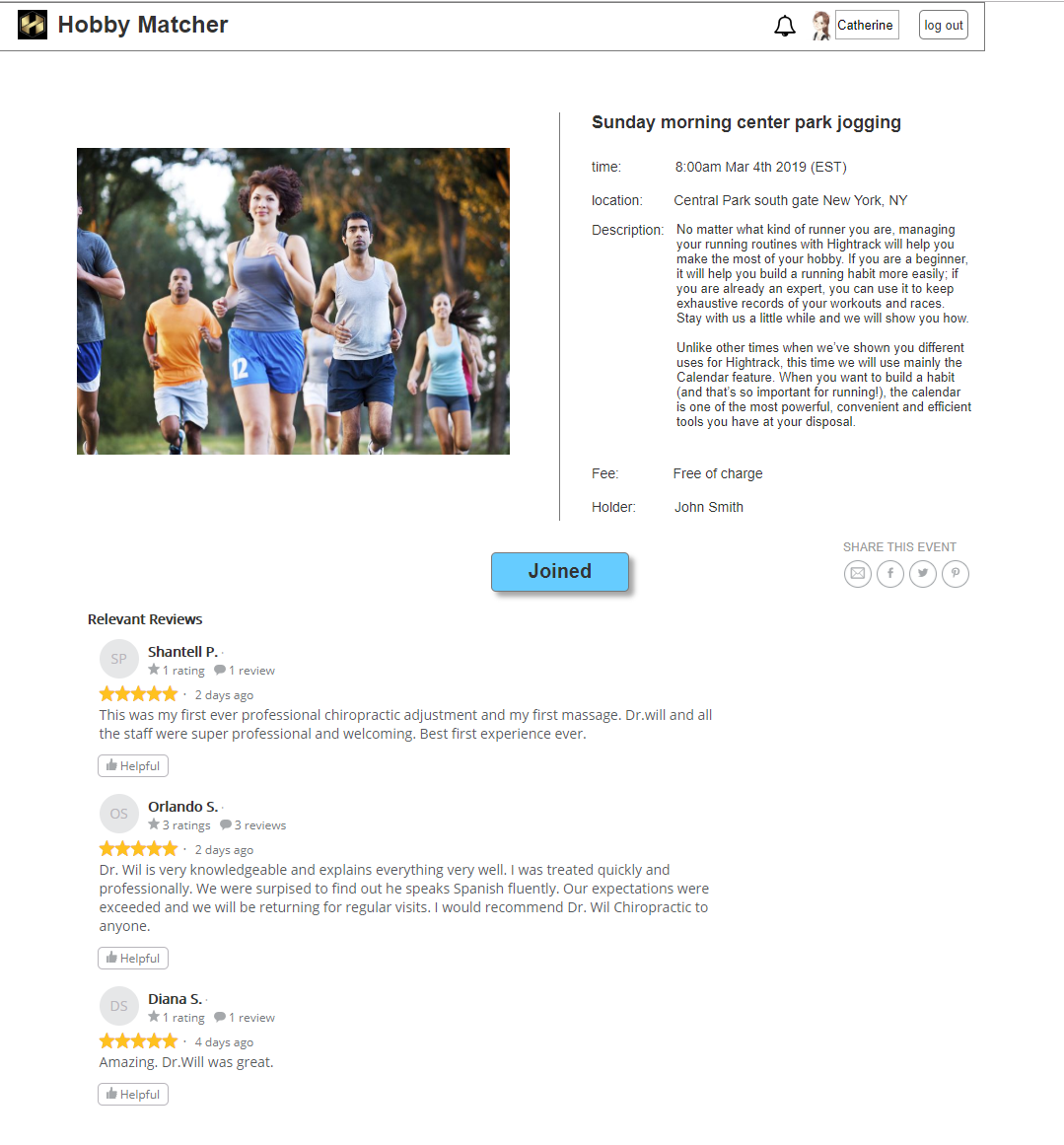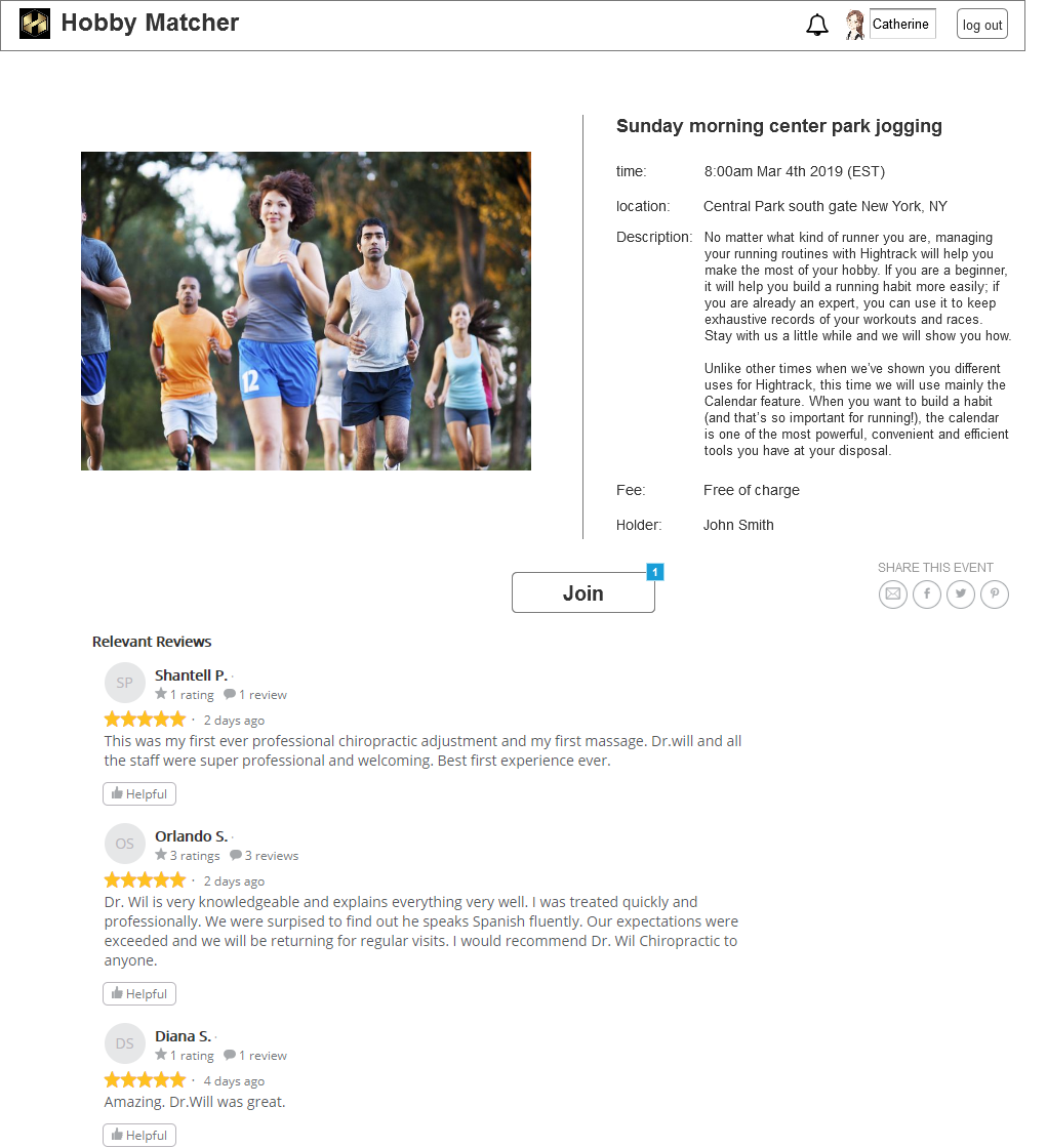 After the user click on the "Join" button, that button will change its background color to a blue background, and from "Join" to "Joined", and click another time to the "Joined" button, it will become to "Join" button again, back to former status, it is just, click "Join", the button changed to "Joined", right now, the user is joined in that event, click on "Joined", it changes to "Join", right now, user is not participating in that event. The second picture will show the status after click "Join".