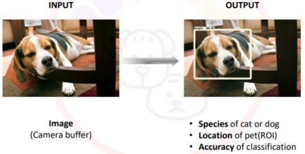사용자의 반려동물을 카메라 앵글 안에 위치시킨다. 딥러닝을 통해 학습된 AI가 카메라상의 반려동물이 강아지인지 고양이인지와 그중 어떤 종에 속하는지를 나타낸다. 그 데이터를 이용하여 메인 화면에 반려동물 사진과 종류, 품종을 갱신하고 커스텀 화한다.