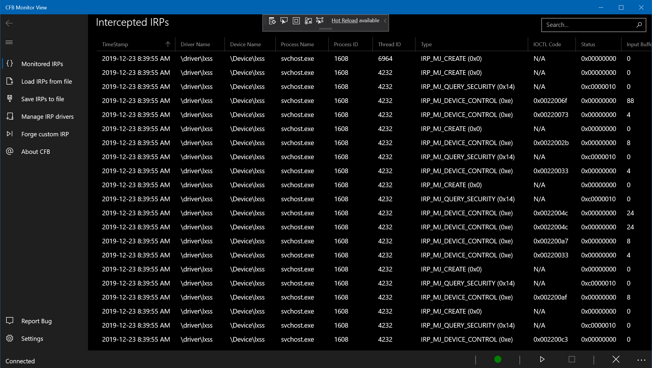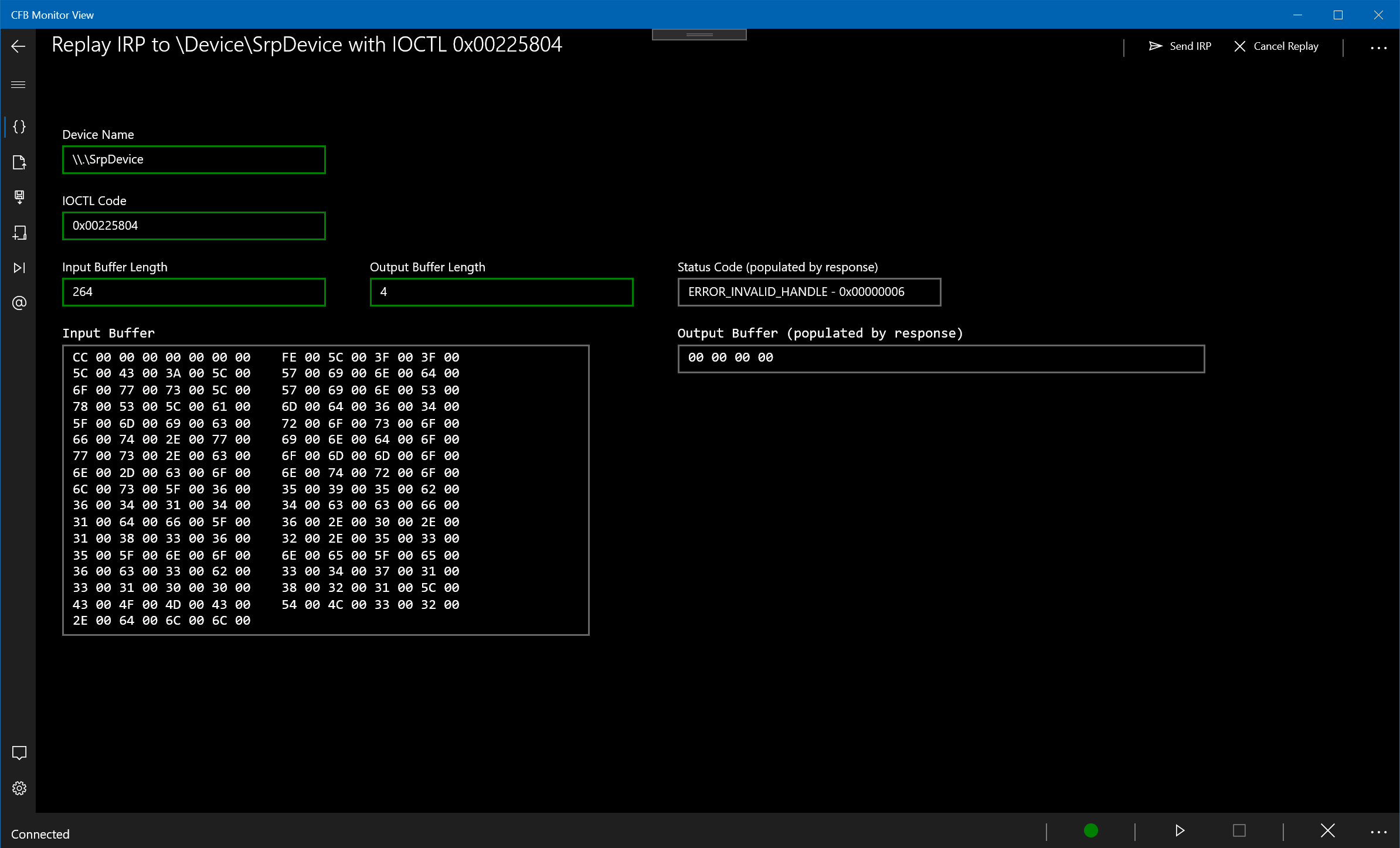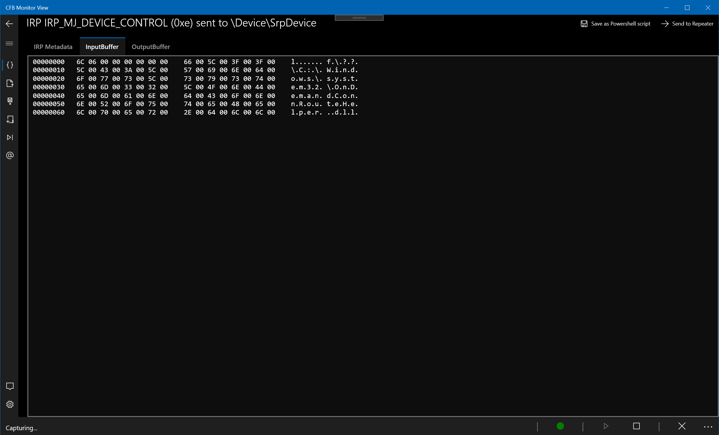 ProcMon-style: it will connect to wherever the broker is, and provide a convienent GUI for manipulating the broker (driver enumeration, hooking and IRP capturing). It also offers facililties for forging/replaying IRPs, auto-fuzzing (i.e. apply specific fuzzing policies on each IRP captured), or extract IRP in various formats (raw, as a Python script, as a PowerShell script) for further analysis. The captured data can be saved on disk in an easily parsable format (*.cfb= SQLite) for further analysis, and/or reload afterwards in the GUI.