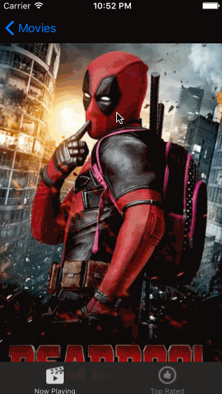 - User can select from a tab bar for either Now Playing or Top Rated movies.