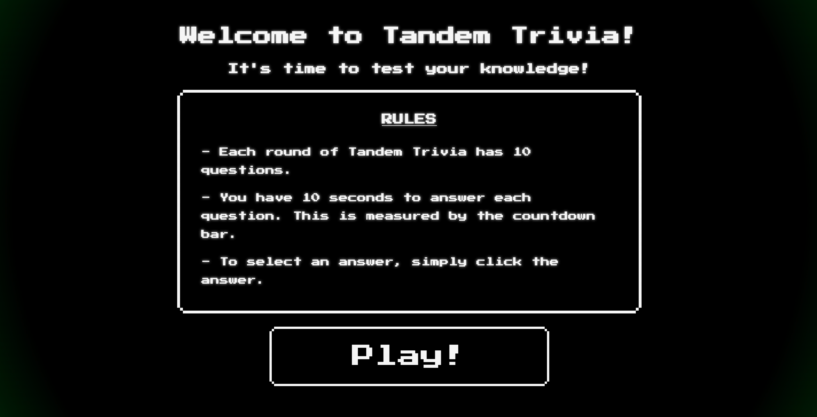 A hub to test your trivia skills against your coworkers at Tandem.