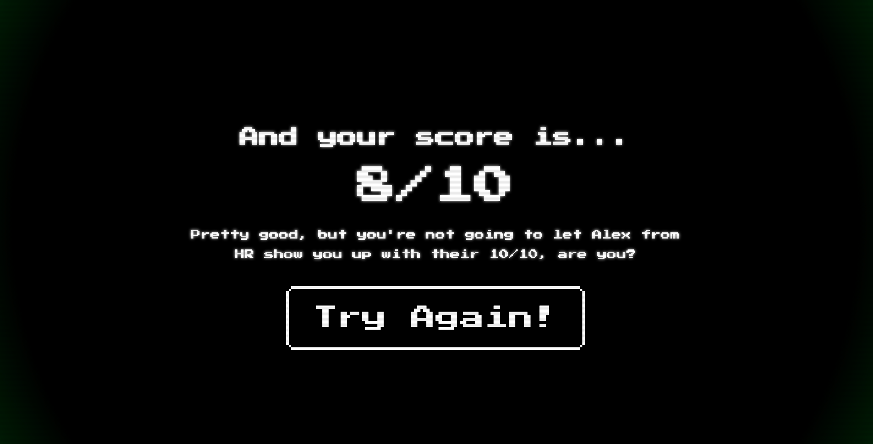 Developed simply with Vanilla JavaScript, the player will be pitched a random assortment of 10 trivia questions, and will have 10 seconds to answer reach question. At the end of each round, the score will be tallied and the player will be greated with a snarky, or complimenting comment depending on their score.