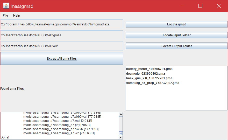 .gmafiles. - Click Extract All gma Files. massgmad will begin extracting all the
