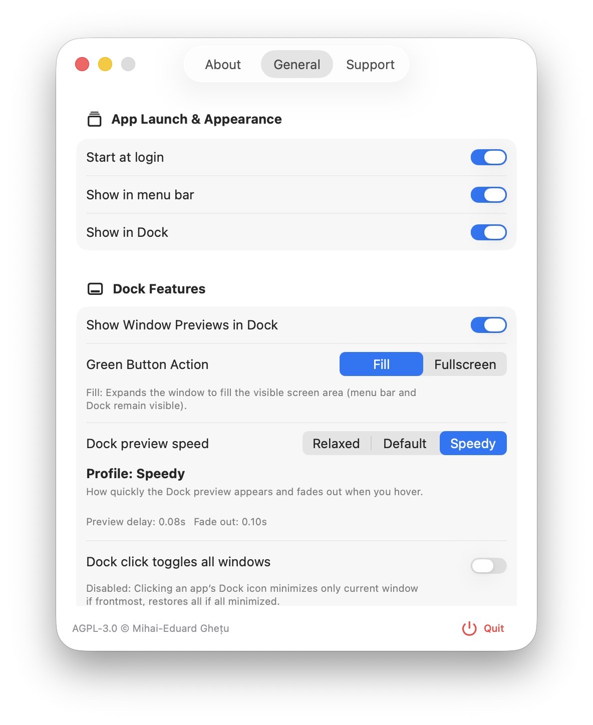 Dock pop-ups with live window previews: Shows a beautiful pop-up when you hover Dock icons, including a diamond indicator for minimized windows