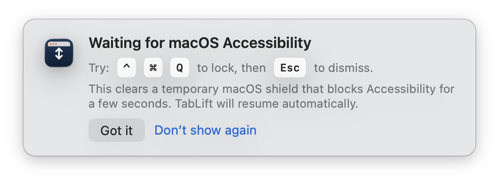 System Settings → Privacy & Security → Accessibility → Enable TabLift