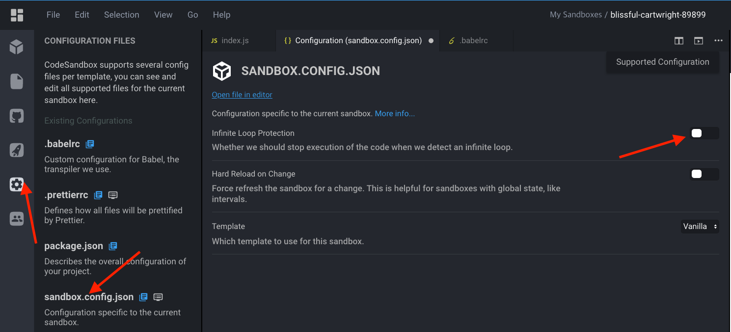 우선, Codesandbox 의 설정에서 sandbox.config.json 을 열어서 Infinite Loop Protection 이라는 속성을 비활성화하세요.