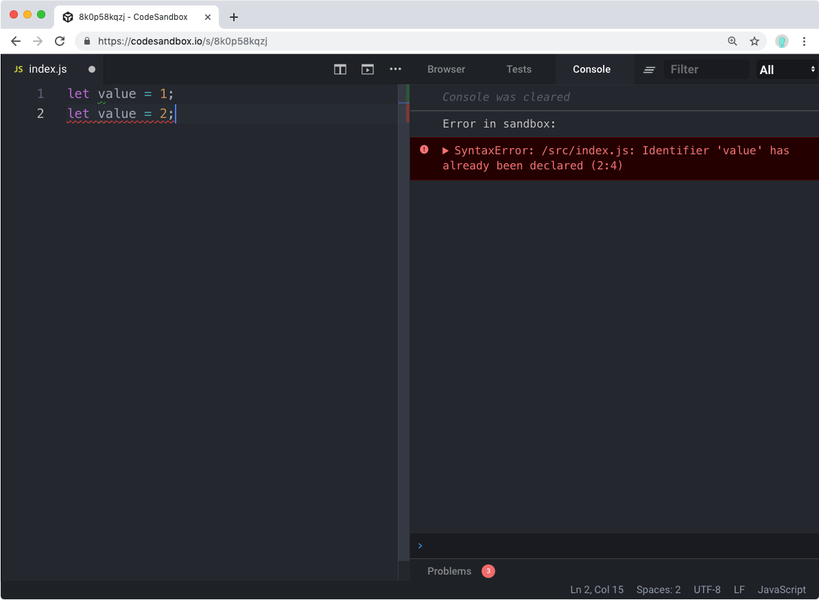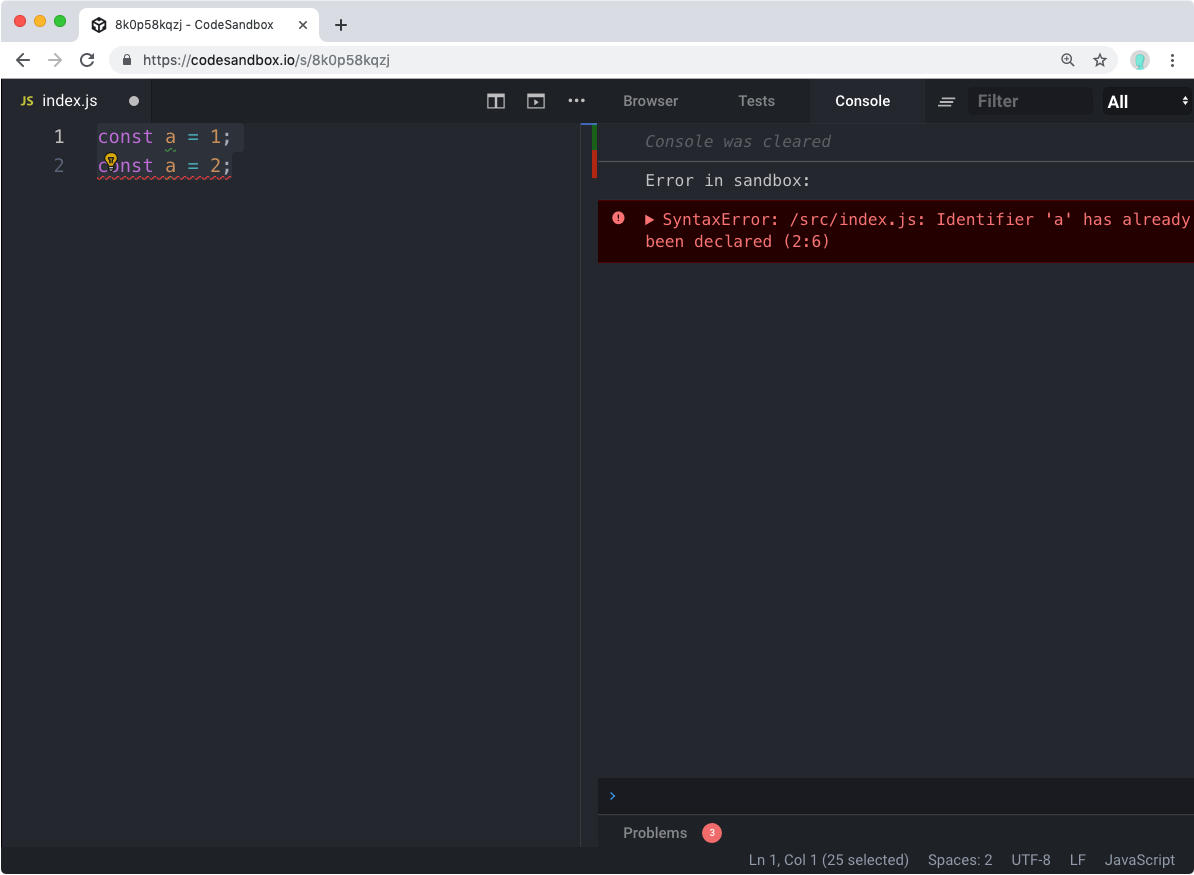 a = 2;"Error: "a" is read-only" 라는 오류가 발생했습니다. 한번 상수로 선언했으면 값을 바꿀 수 없음을 의미합니다.