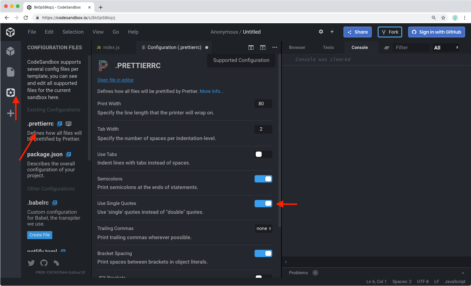 CodeSandbox 에서는 작은 따옴표로 작성을 하면 자동으로 큰 따옴표로 변환을 해줄 것입니다. 자동 변환되는 것을 방지하기 위해서는 CodeSandbox의 좌측의 설정 아이콘을 누르고, .prettierrc 의 Create File 버튼을 누르고 나서 Use Single Quotes 를 활성화하세요.