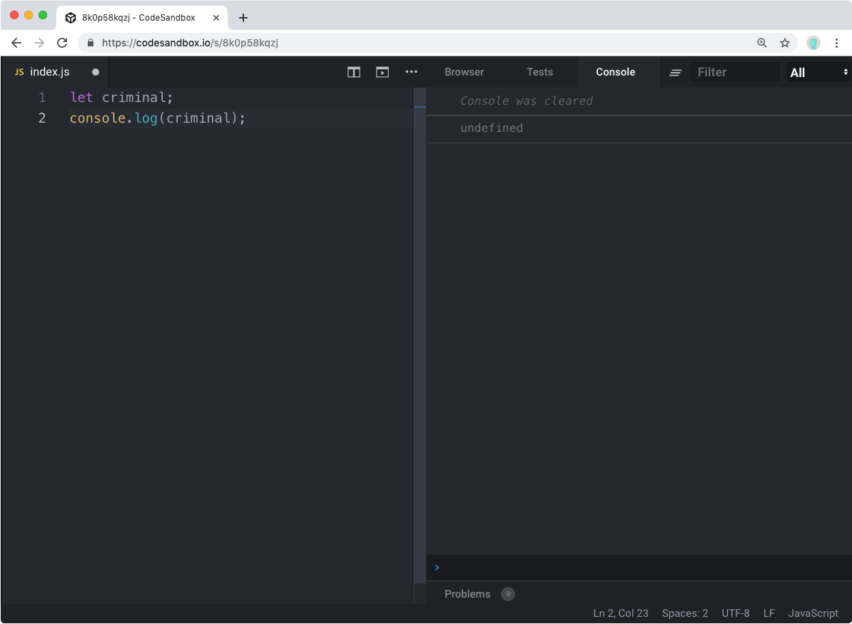 console.log(criminal);criminal 이라는 변수를 선언하긴 했지만 값을 지정해주지는 않았습니다. 이를 console.log 를 통해 보여주도록 하면 undefined 라는 값이 나타나게 됩니다.