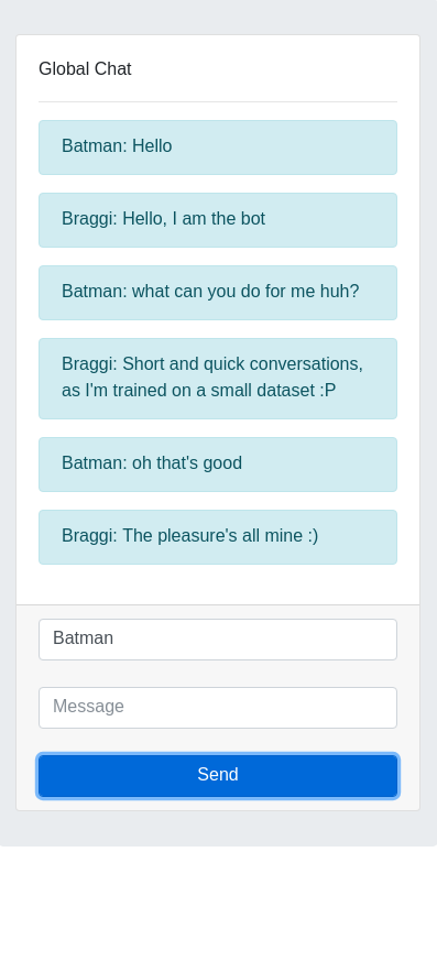 Braggi is a Python based Contextual Chatbot Framework, which hopes to integrate all the necessities for a great chatbot framework, to satisfy both enterprise and general audiences alike. Development still underway, more features on the way ๐