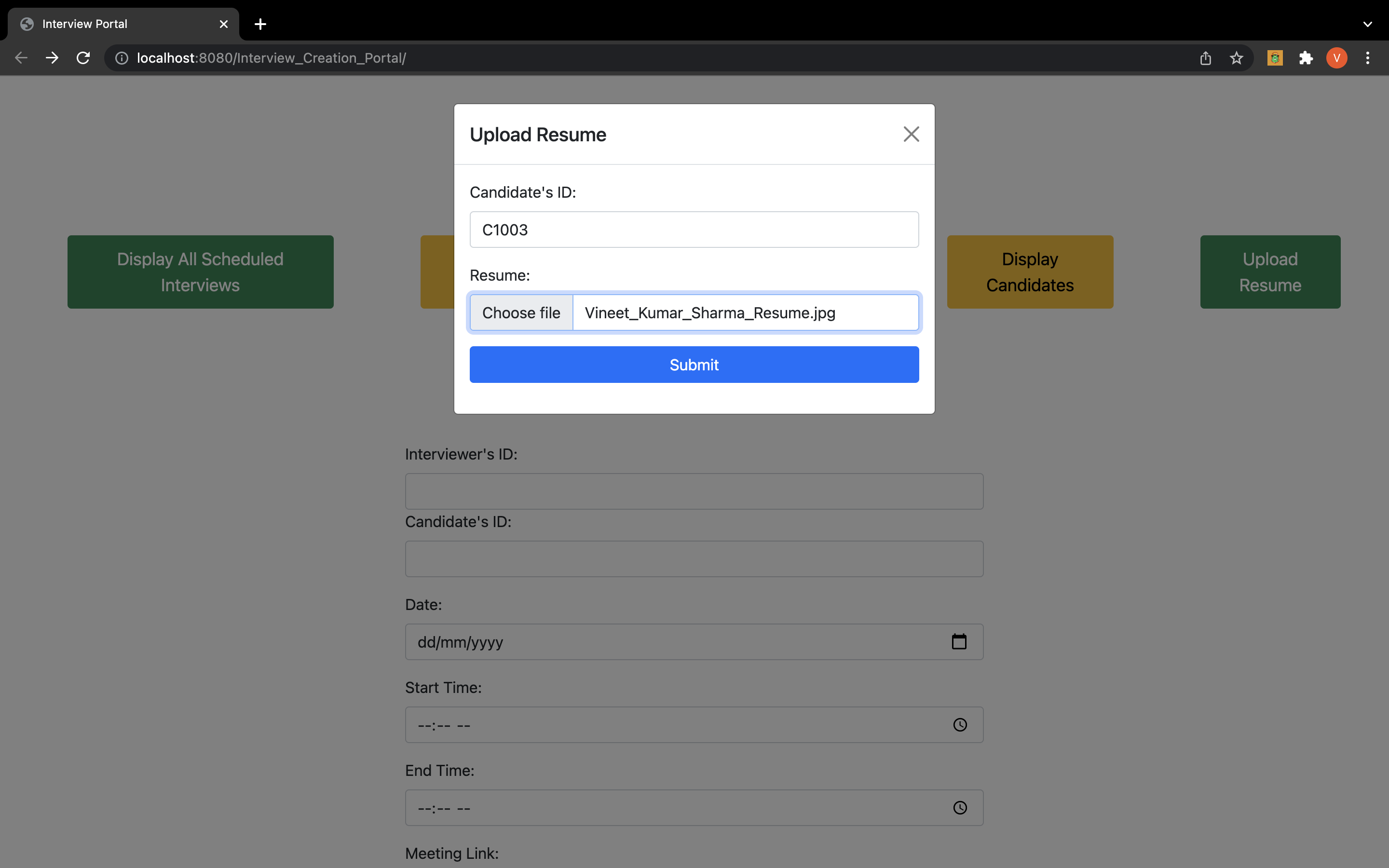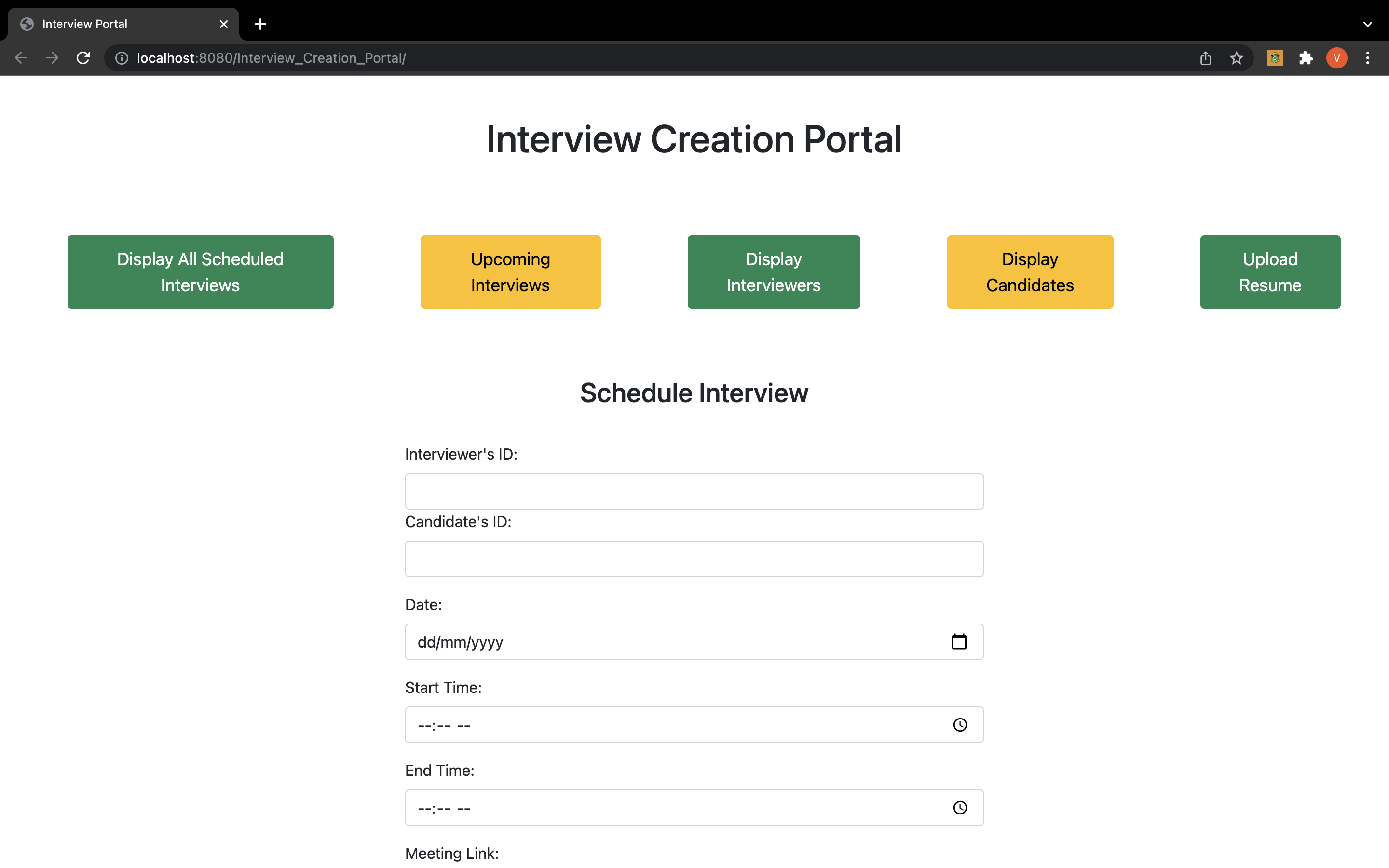 An interview creation page where the admin can create an interview by selecting participants, start time and end time.