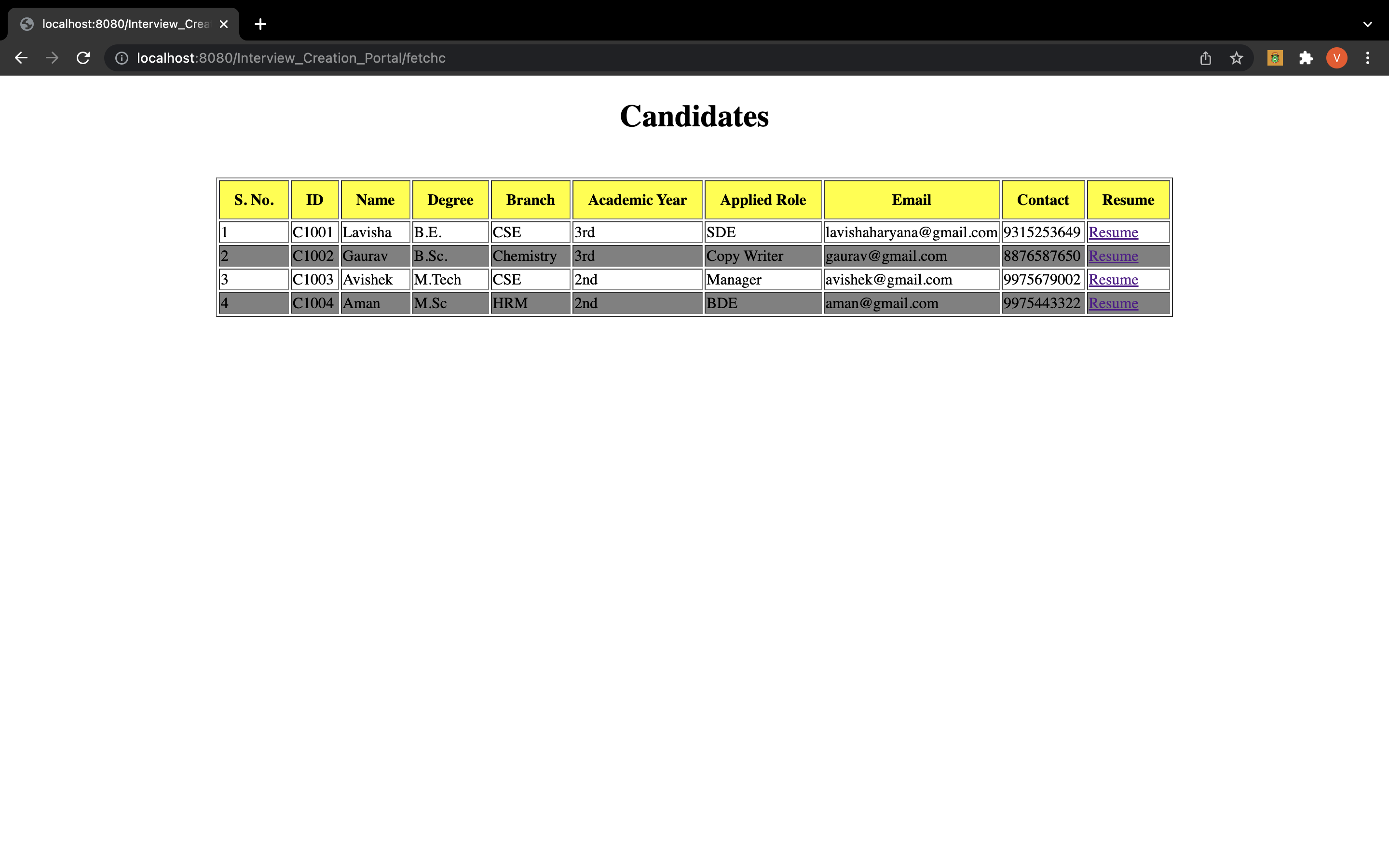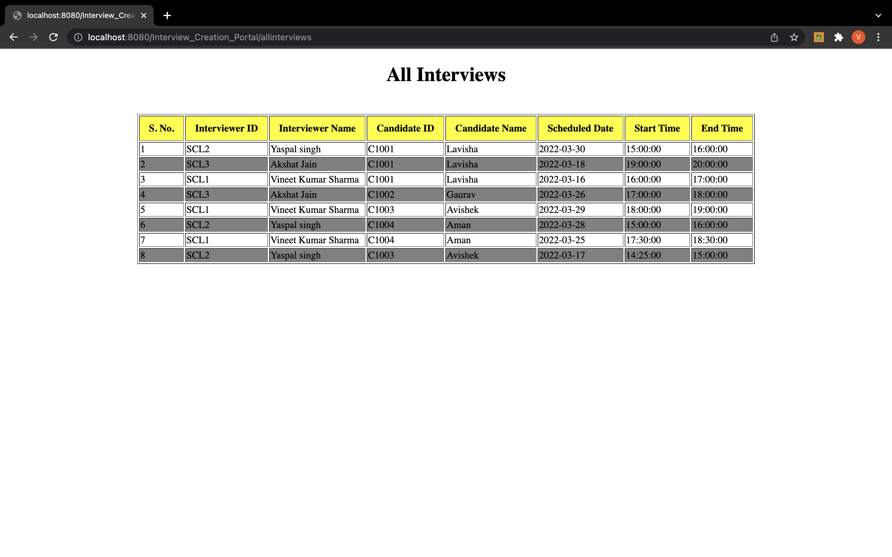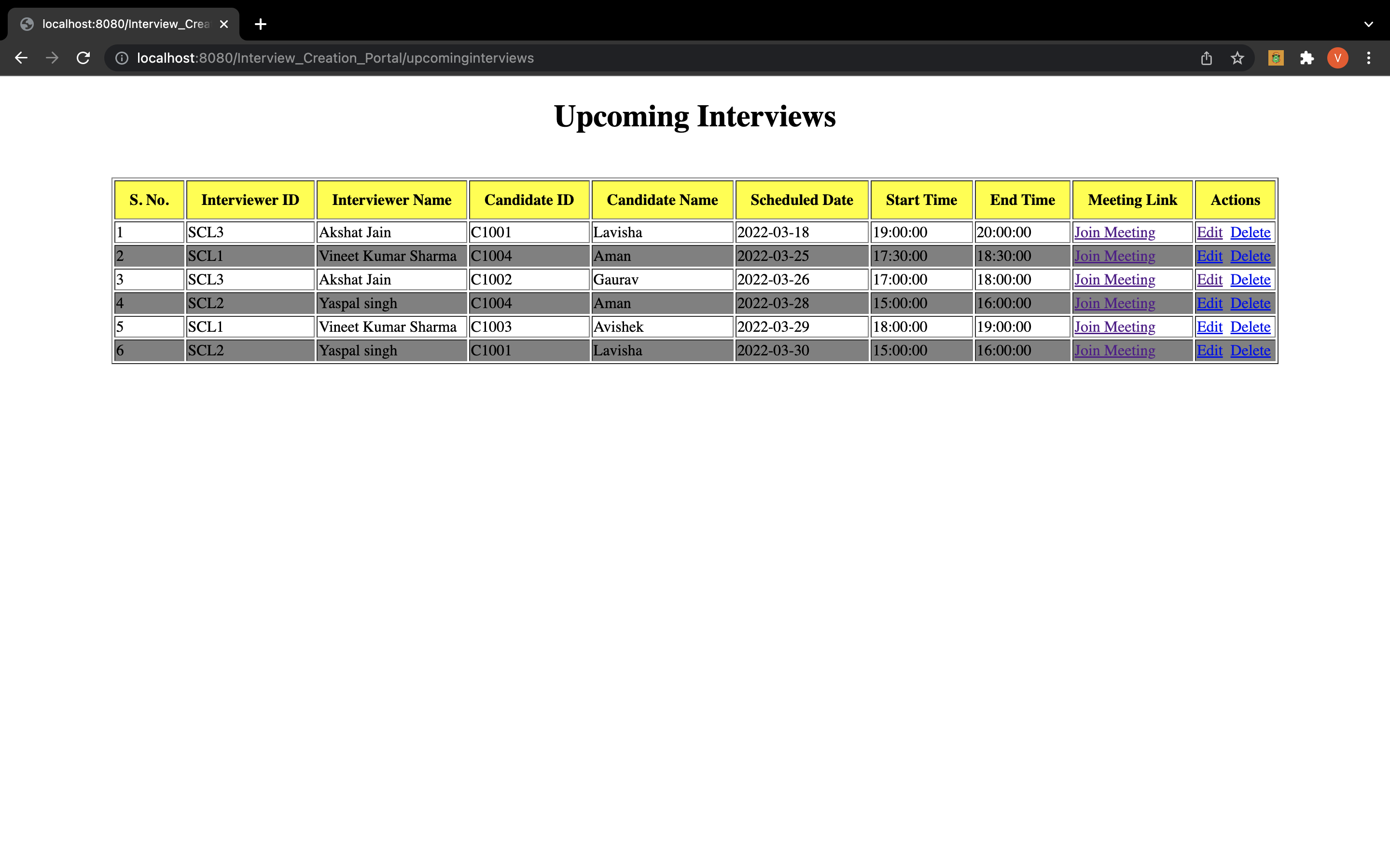 An interviews list page where admin can see all the upcoming interviews.