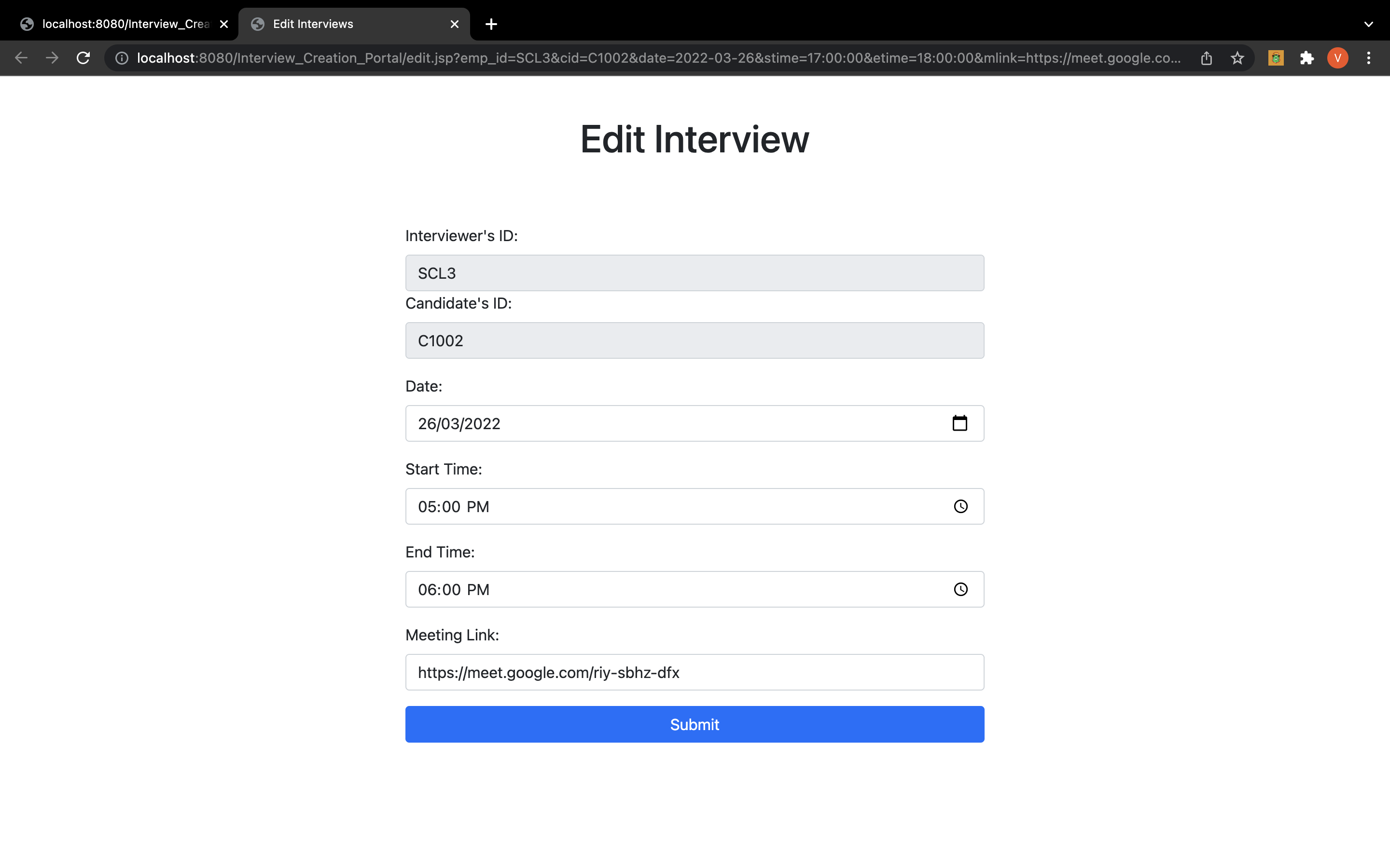 An interview edit page where admin can edit the created interview with the same validations as on the creation page.