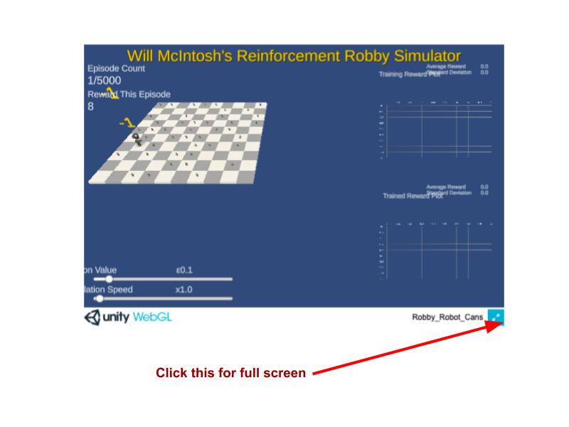 There are two graphs, one that represents Robby’s performance while he is training, (the first round of the episodes) and then again the second time with the same round of the same amount of maximum episodes set by the user. The first half will record in the top “Training” graph while the second will be recorded in the bottom graph “Trained”. This will show both the average reward points and standard deviations.