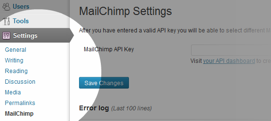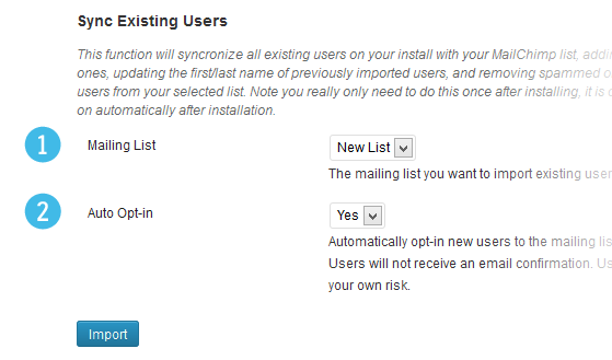 1. Select your Mailing List. 2. Select whether to Auto Opt-in your users or not. 3. Click Import to synchronize your WordPress users to your MailChimp list. The bottom section of your MailChimp settings page is a very handy excerpt of the error log. It will display the most recent 100 lines right in your admin to help you with troubleshooting. It even tells you if email addresses have been banned.