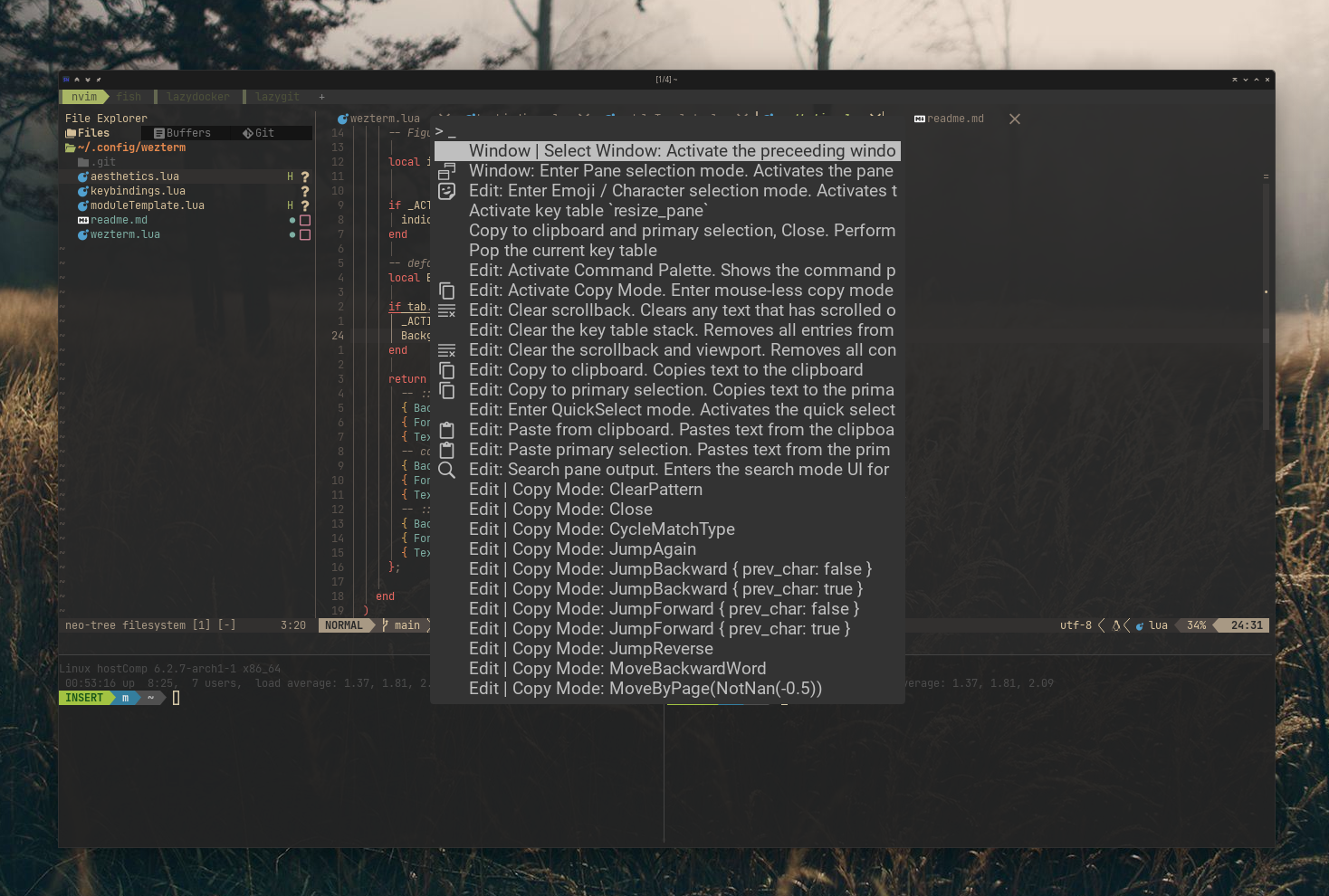 My alterations on an aesthetic level are the usage of the gruvbox colorscheme and the tabline, opacity, which has been manually altered