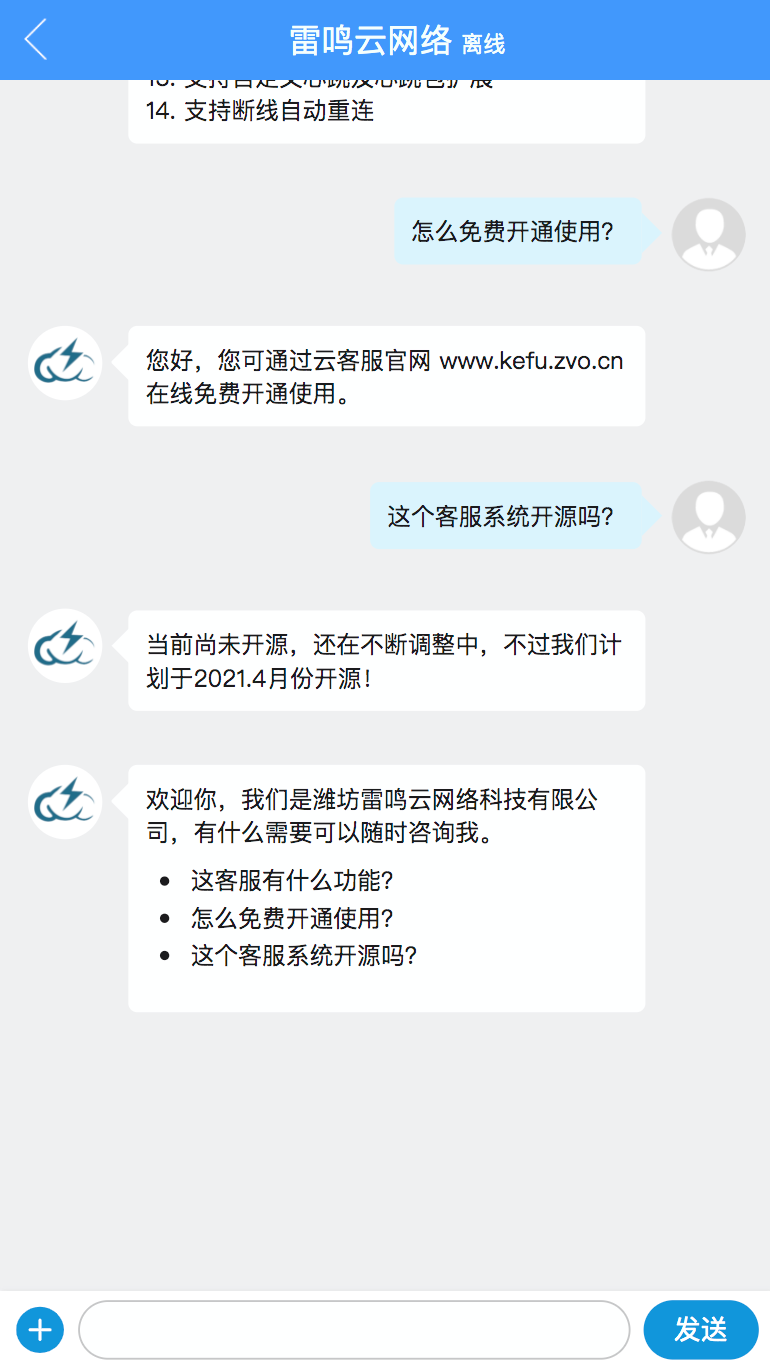 - 当用户发送消息,但客服不在线时,会自动发送设置好的一段文字给用户