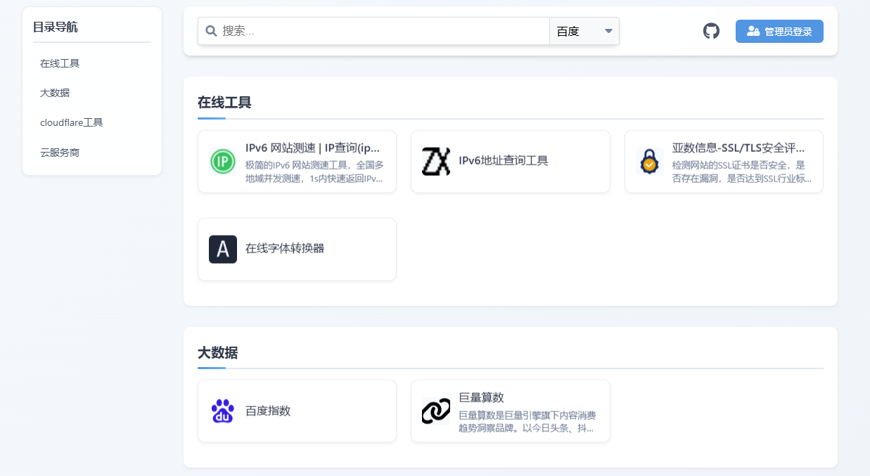 一个简洁、现代的网址导航页面,基于 Cloudflare Workers 和 D1 数据库构建,支持动态修改,无需服务器。支持分组管理、组链接排序、链接管理等。