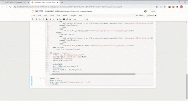 Instagram_crawler 프로젝트A - 3.데이터수집 폴더 실행을 위한 파일 Insta_craw.ipynb Insta_Craw.py secret.txt 실행을 위한 선수작업 txt파일에 아이디, 비번 입력 후 저장 실행예시 이미지 insta_dict에 담긴 데이터는 instagram_data.json파일로 저장됨. 인스타그램 크롤링 시연 인스타그램 시각화