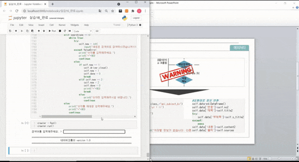 naver_crawler ** crawler_class_mode.py는 불필요(jw.py모듈 미적용,블로그크롤링 코드있음) 실행을 위한 파일 naver_crawler_final.py jw.py 실행코드 crawler = Run() crawler.run() 실행예시 이미지 네이버 크롤러 시연